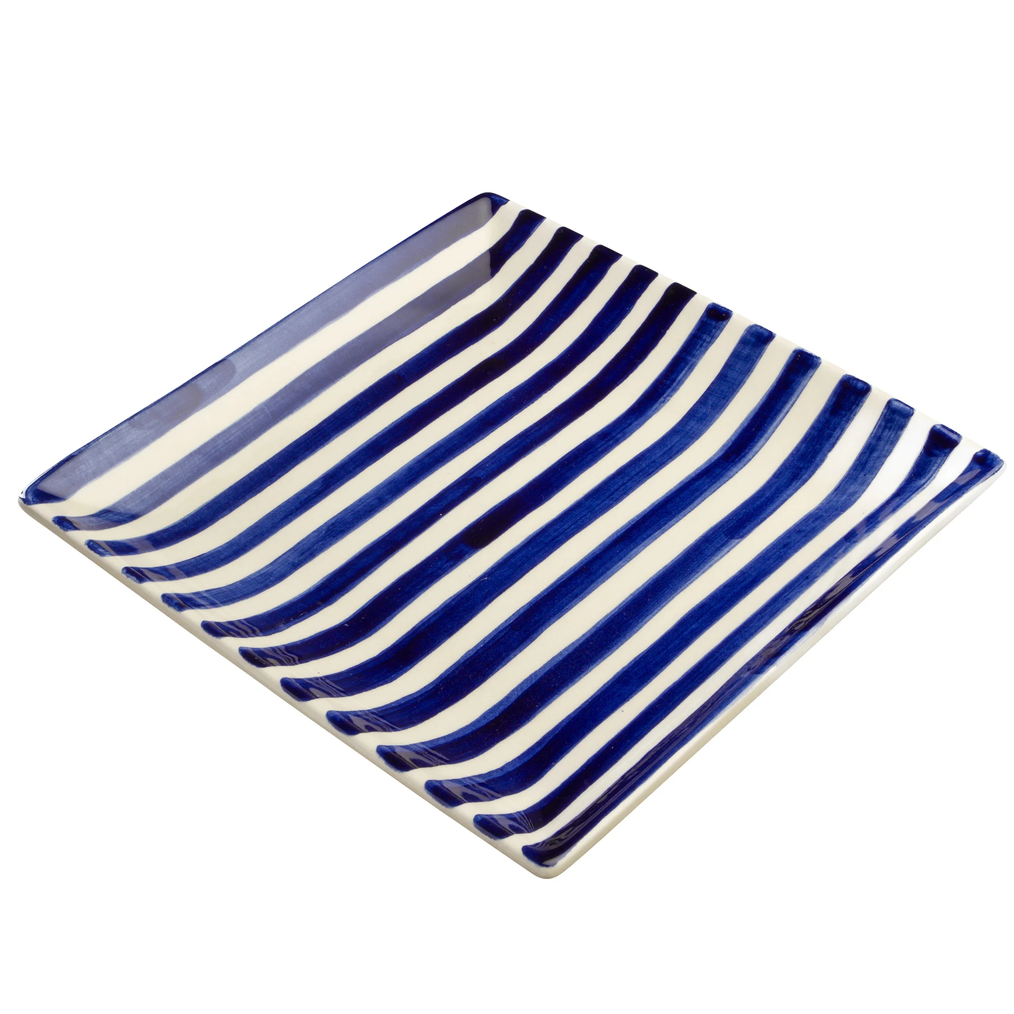 Schöner quadratischer Teller mit grafischem Streifenmuster in kräftigem Azurblau. Handbemalt. Maß 25 x 25 cm. Achtung: Nicht in der Spülmaschine spülen.